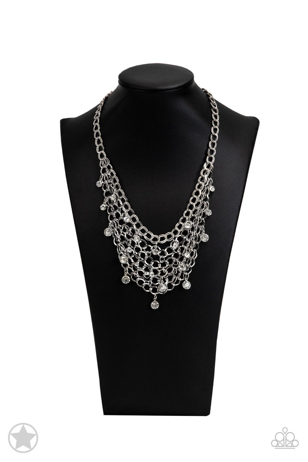 A collar of layered interlocking silver chain provides the canvas for gorgeous clear rhinestones to sway delicately. Features an adjustable clasp closure. BLOCKBUSTER