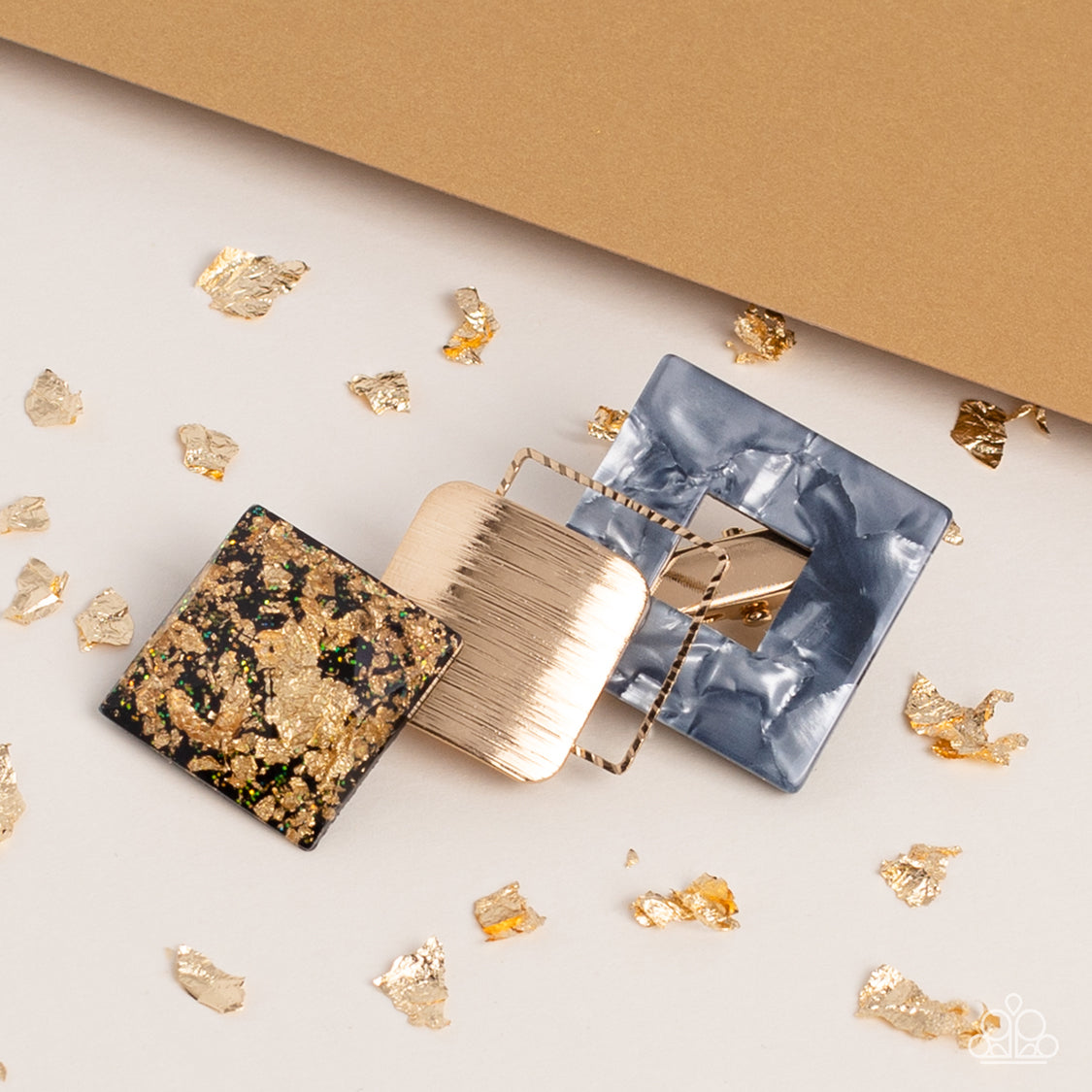Infused with gold sparkles, a faceted black acrylic frame delicately overlaps with a golden square and a black shell-like frame across the front of a classic gold bar for a deco inspired finish. Features a standard hair clip on the back.
