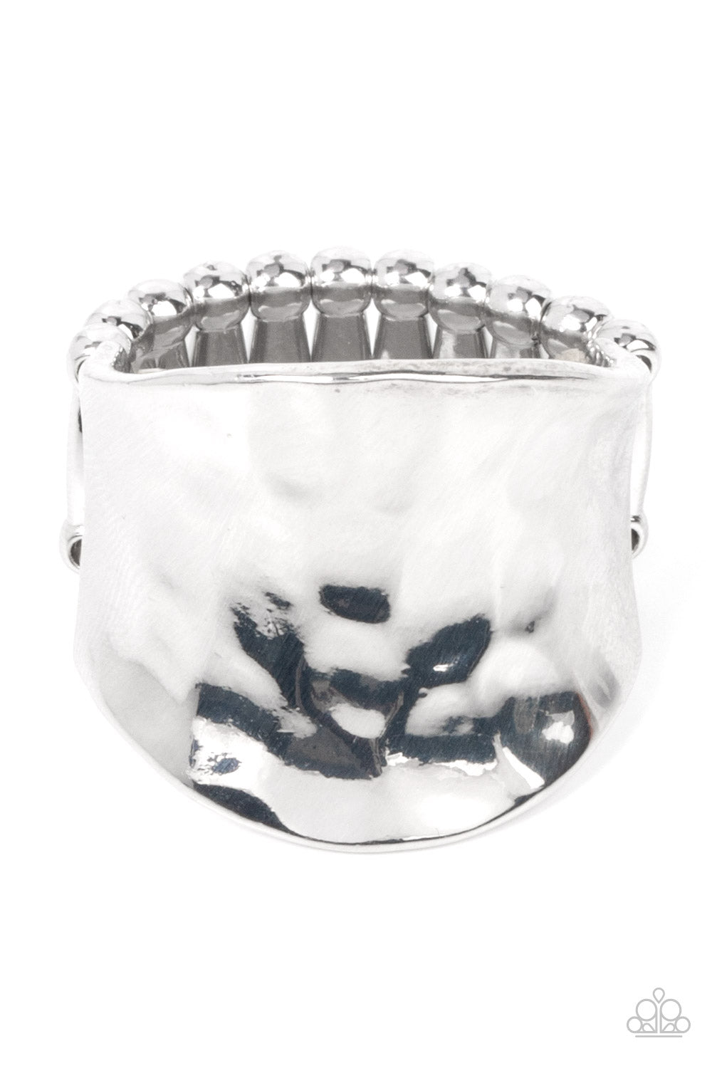 A beveled silver frame is delicately hammered in shiny details, resulting in an artisanal shimmer atop the finger. Features a stretchy band for a flexible fit.