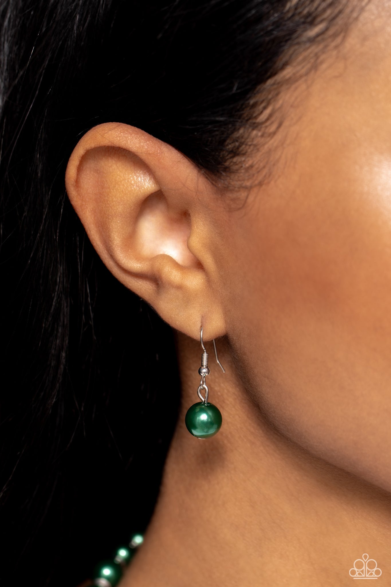 A single strand of emerald green pearls elegantly cascades below the collar, creating a glamorous graceful effect. Features an adjustable clasp closure.