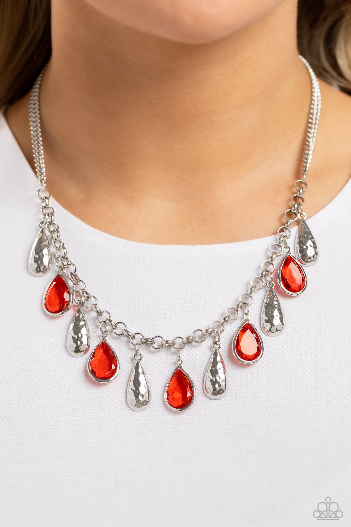 Two strands of silver chain are attached to a silver link chain for a flashy metallic display. Adorning the linked chain, faceted clear red teardrops and hammered, beveled, silver teardrops add hints of shimmer to the design, creating a flirtatious fringe around the collar. Features an adjustable clasp closure.
